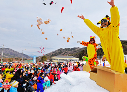 昨日は一足早く、節分にちなんだ「鬼は外、福は内」のお菓子投げイベントを行いました。イベント会場のそり専用ゲレンデには、ファミリーを中心にたくさんのお客様が集まり、盛り上がりました。当初は午前中のみの予定でしたが、午後にも二回目を行いました。